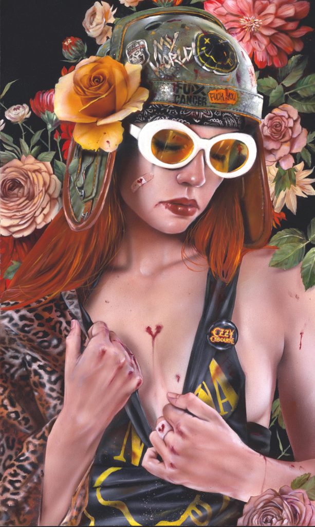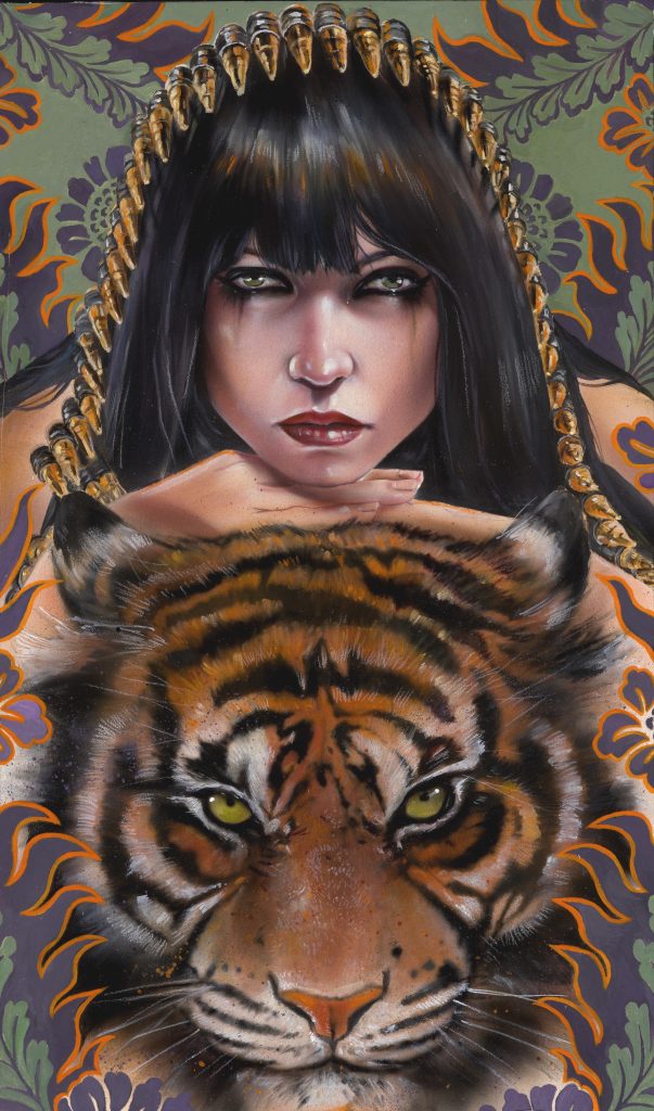 Brian M. Viveros returns to Beinart Gallery with TRUE GRIT, a title evoking strength, power, resilience, and the ability to persist despite adversity. Known for his iconic signature portraits of fierce, powerful, smoky-eyed women, Viveros once again dives into his world of “DirtyLand,” where blood, beauty, and bravado collide. This body of work pushes Viveros into new territory, incorporating floral motifs, bolder color palettes, and fresh new techniques. His ‘Woman of Power’ remain battle-ready and defiant as ever, wearing their battle scars like armor.