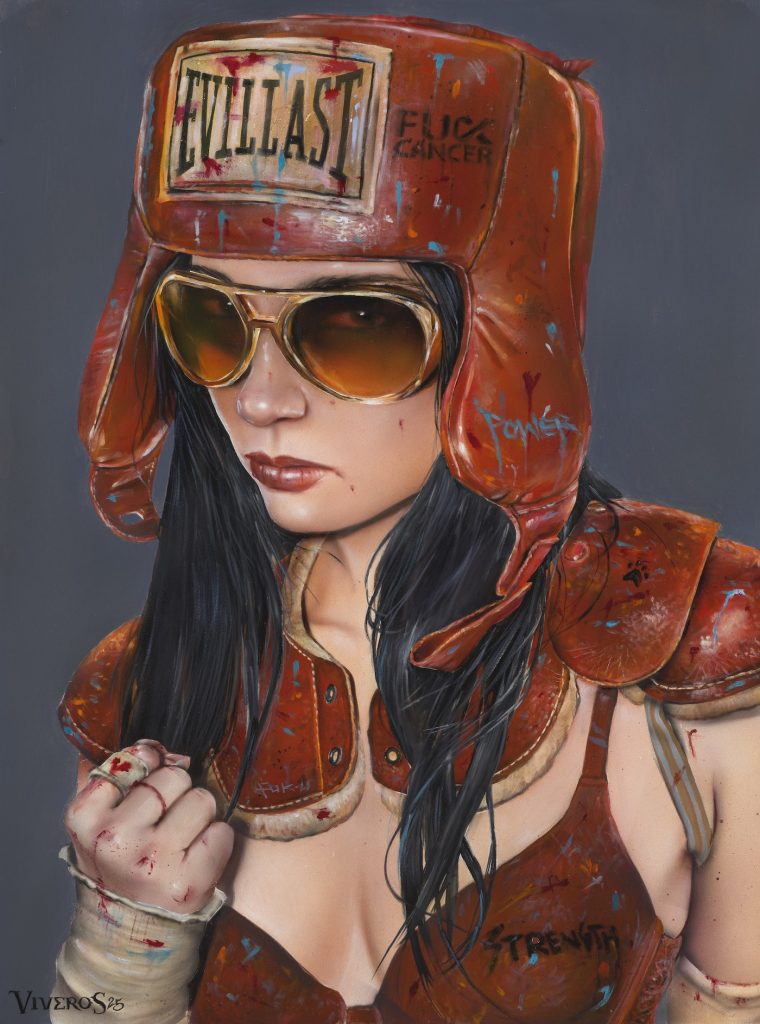 Brian M. Viveros is a California-based artist best known for his meticulously detailed portraits of femme fatales. Drawing on pop culture, lowbrow, and tattoo aesthetics, Brian has created his own iconic signature Dirtyland world of Anti-Pinup warriors! Viveros has exhibited extensively internationally and continues to build a loyal following with his depictions of dangerous vixens.
